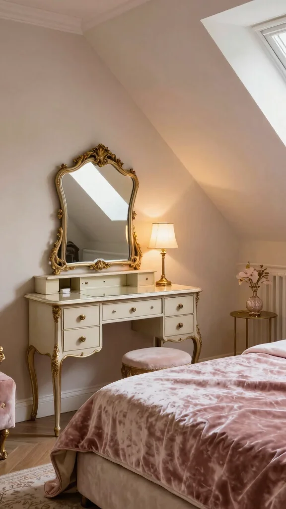 Fun fact: Velvet fabrics and gold accents can instantly elevate an attic bedroom into a glamorous retreat. Add an ornate vanity and a plush upholstered headboard, then layer deep jewel tones for a refined, practical upgrade to your attic bedroom ideas.