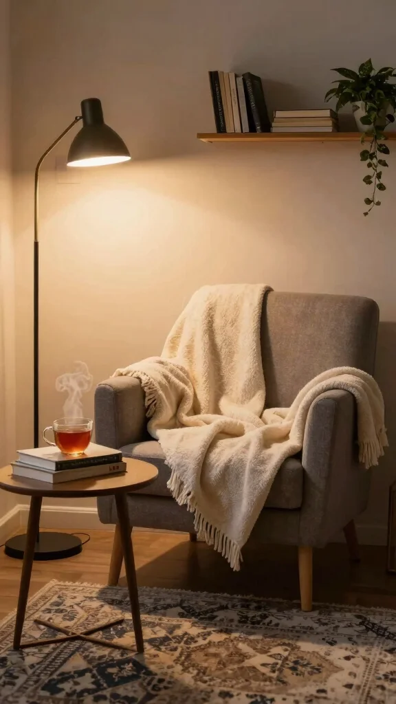 To enhance the coziness, opt for warm lighting, such as a floor lamp casting a soft glow. Layering rugs adds comfort and visual interest, making it an ideal place for reading or enjoying a cup of tea.