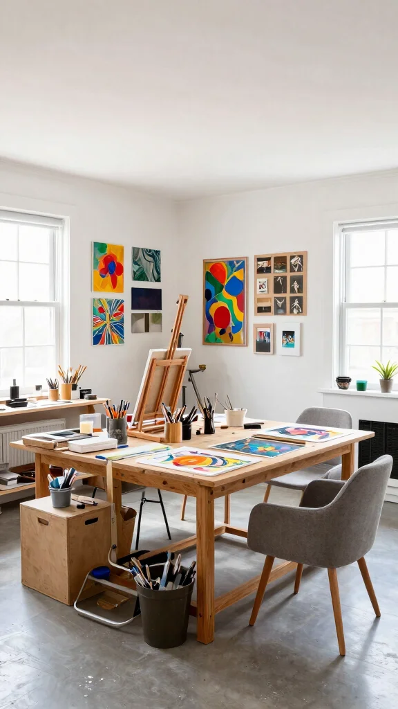 Incorporate storage solutions for art supplies to keep everything organized and within reach. Displaying artwork or inspiration boards on the walls adds character and motivation to the space.