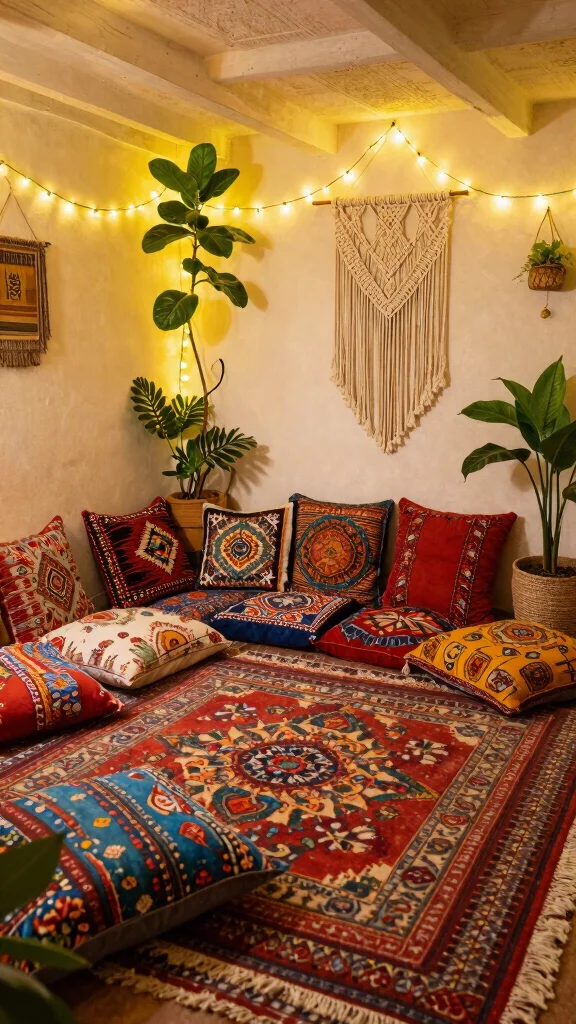 Bohemian basement living room ideas prove that comfort comes first. Cozy layers, earthy colors, and string lights turn a small space into a warm haven. Add floor cushions and low furniture, and lounging becomes simply effortless.