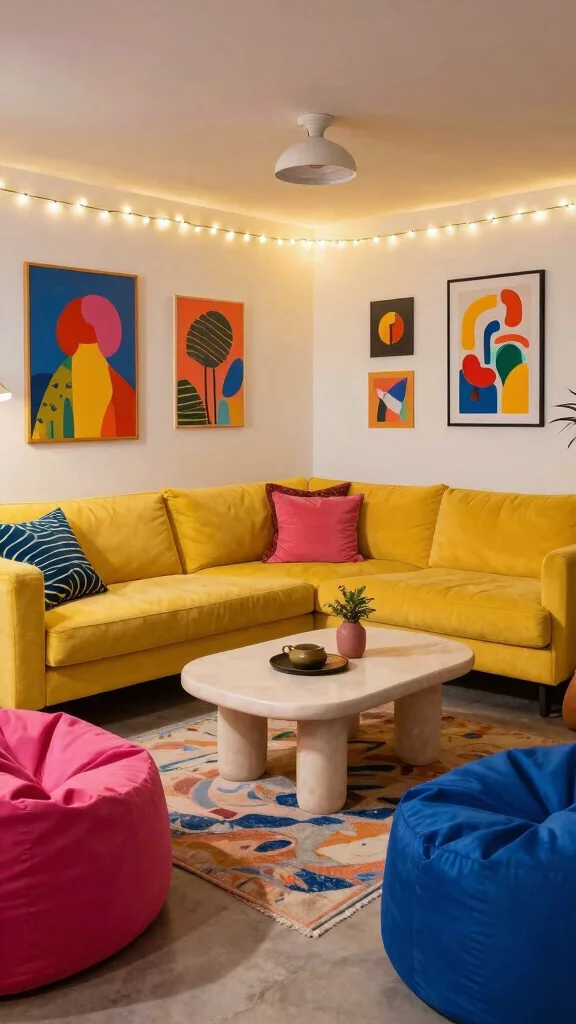Modular furniture allows for flexibility, letting you rearrange pieces based on your activities, whether it’s movie nights or game days. Bold wall art can further elevate this playful atmosphere.