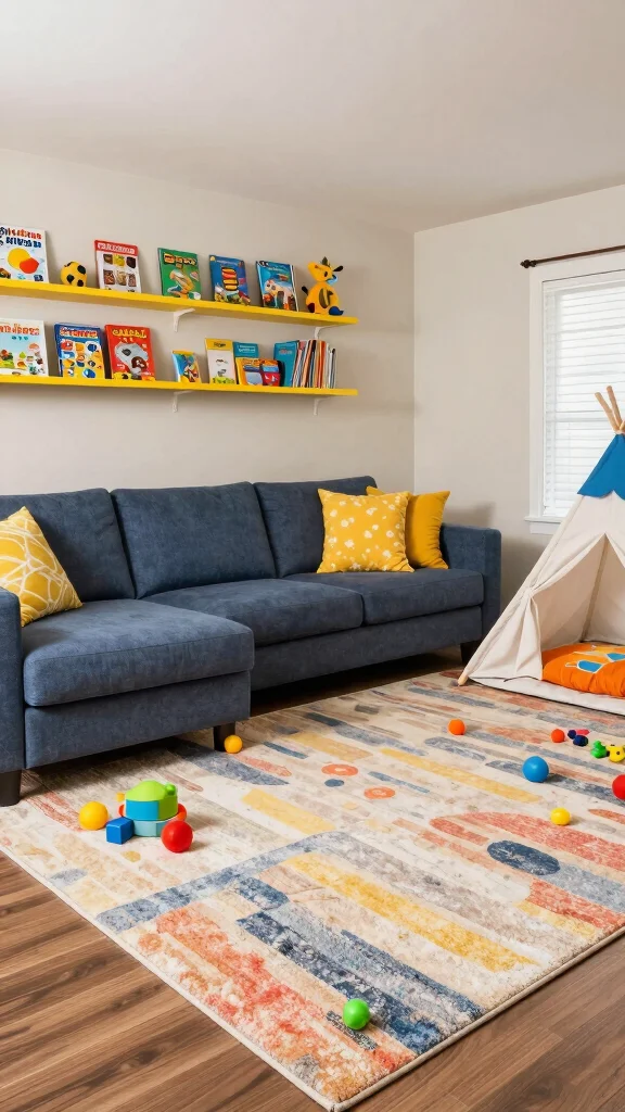 Colorful, soft rugs can define the area and provide a safe play surface, while a sectional sofa ensures ample seating for family movie nights.