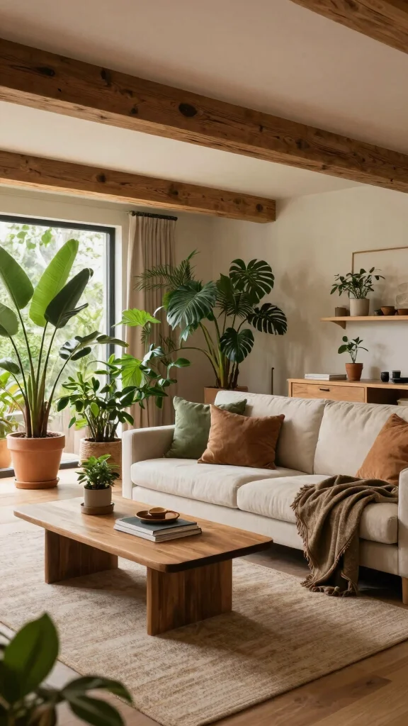 Liven up the space with plants and greenery, enhancing its natural appeal. If possible, large windows or glass doors can connect your indoor space with the outdoors.