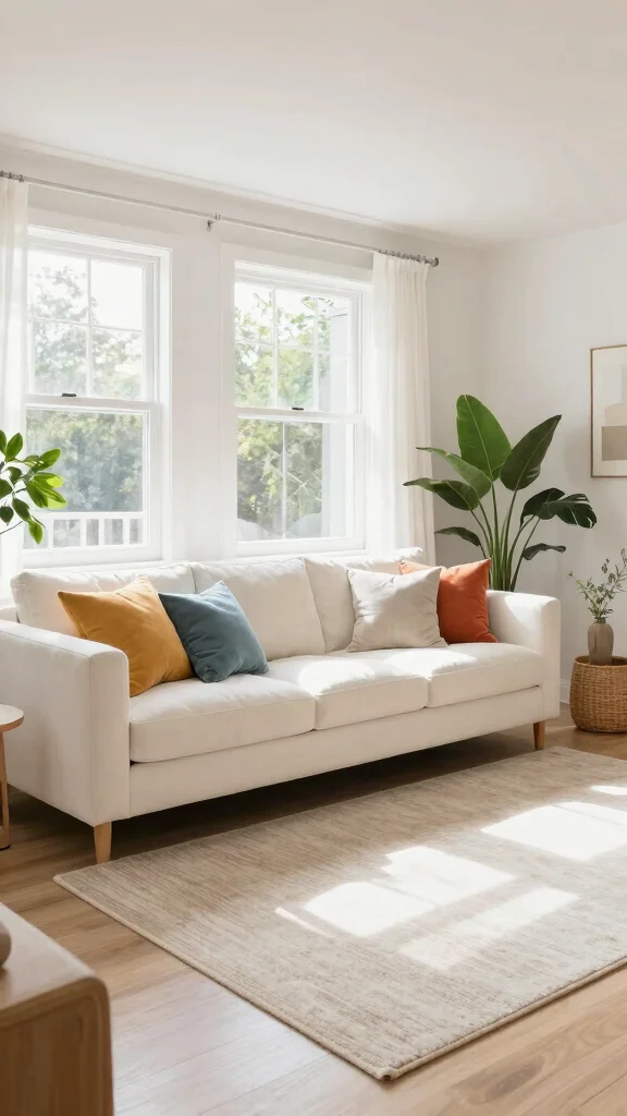 A light area rug can define the seating area without feeling heavy, while white or soft-hued furnishings help maintain the bright vibe.