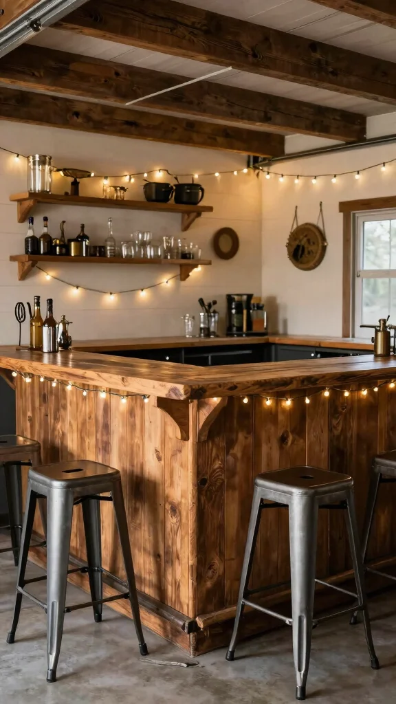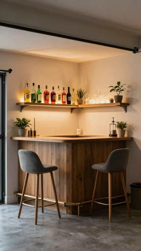 Utilize a small corner in your garage for a compact bar setup, maximizing space while creating a cozy spot.