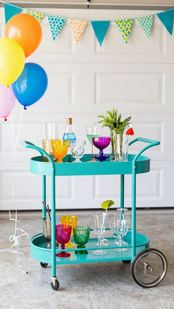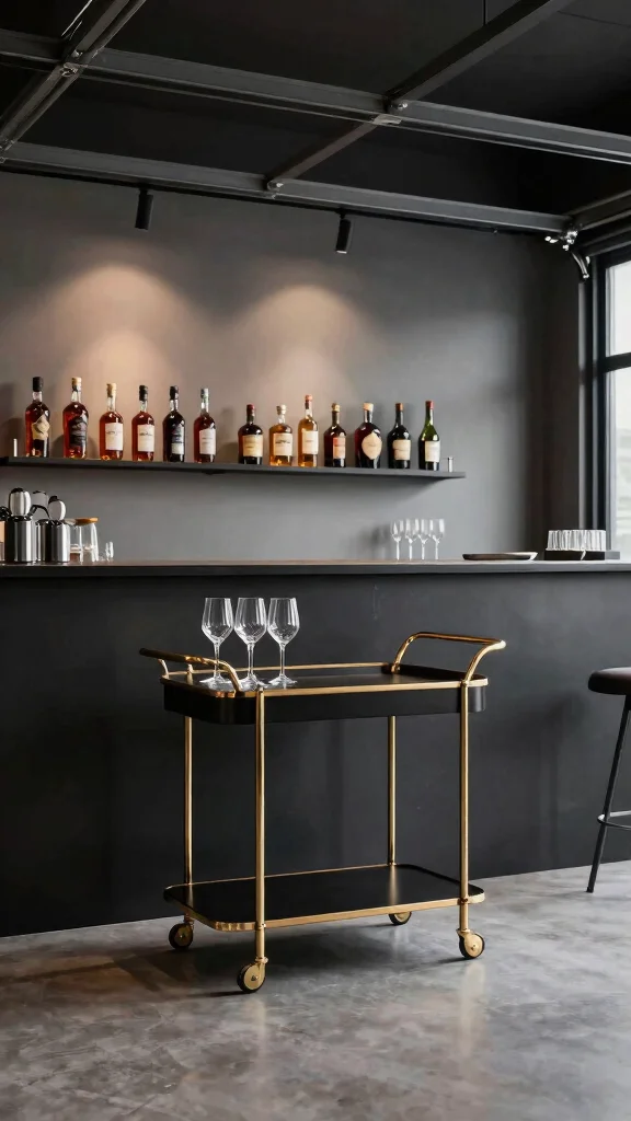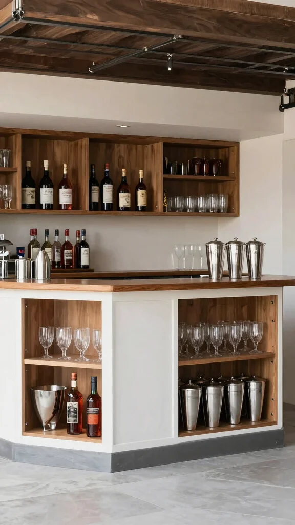 Choose a slim, modular unit and add a mirrored back or glass rack to visually expand the area. Add under-shelf lighting for ambiance and easy mixing, then use a narrow rolling cart to bring in or tuck away essentials as needed. Finish with cohesive garage decor ideas like a coordinated color palette to tie the space together.