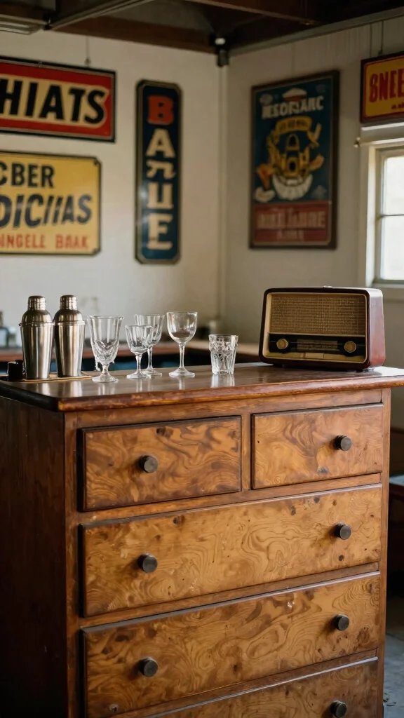 A vintage bar setup can infuse your garage with nostalgic charm and character. Scour thrift stores for hidden treasures like an old dresser or cabinet that can serve as your bar base. Combine these with retro glassware and vintage cocktail accessories to amplify the nostalgic feel. This setup not only provides functionality but also acts as an eye-catching focal point for conversation.