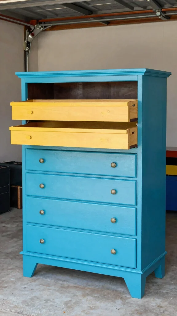 When repurposing furniture, choose pieces that fit your garage’s theme and consider adding casters for mobility. This approach connects with the trend of sustainability and personalized design in home organization.