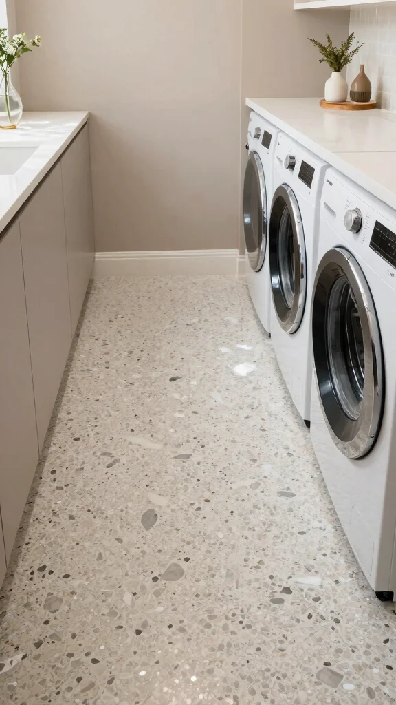 ❝ Fact: Terrazzo flooring can last 50 years with proper sealing and maintenance. It’s one of the top laundry room flooring ideas for durability and eco-friendly style—regular sweeping plus resealing every few years keeps it stunning. ❞