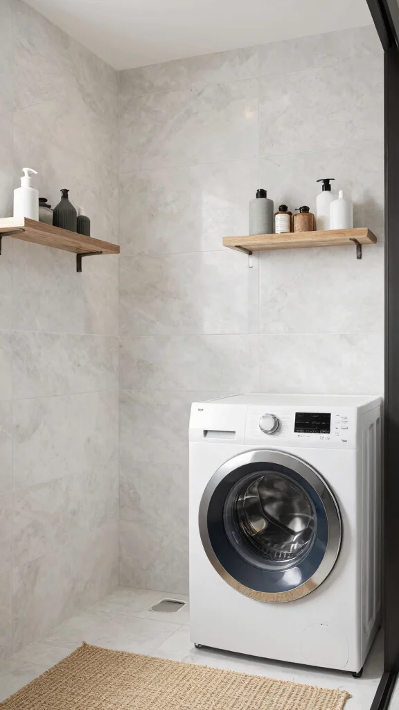 This approach adds a touch of sophistication while keeping the atmosphere warm and welcoming. The natural textures of bamboo enhance the overall design, creating a harmonious space for laundry tasks.