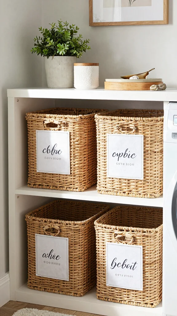 Add functional decor while staying organized by choosing materials that tolerate humidity: woven baskets, canisters with airtight lids, and a moisture-resistant paint color. Label shakers, jars, and bins so you know where everything lives—this home organization tips will help you stay on top of laundry room storage ideas. Use a cohesive color palette and small decorative items like a framed chalkboard with a weekly sorter, or a plant that loves low light. The goal is functional decor that keeps you organized without looking cluttered.
