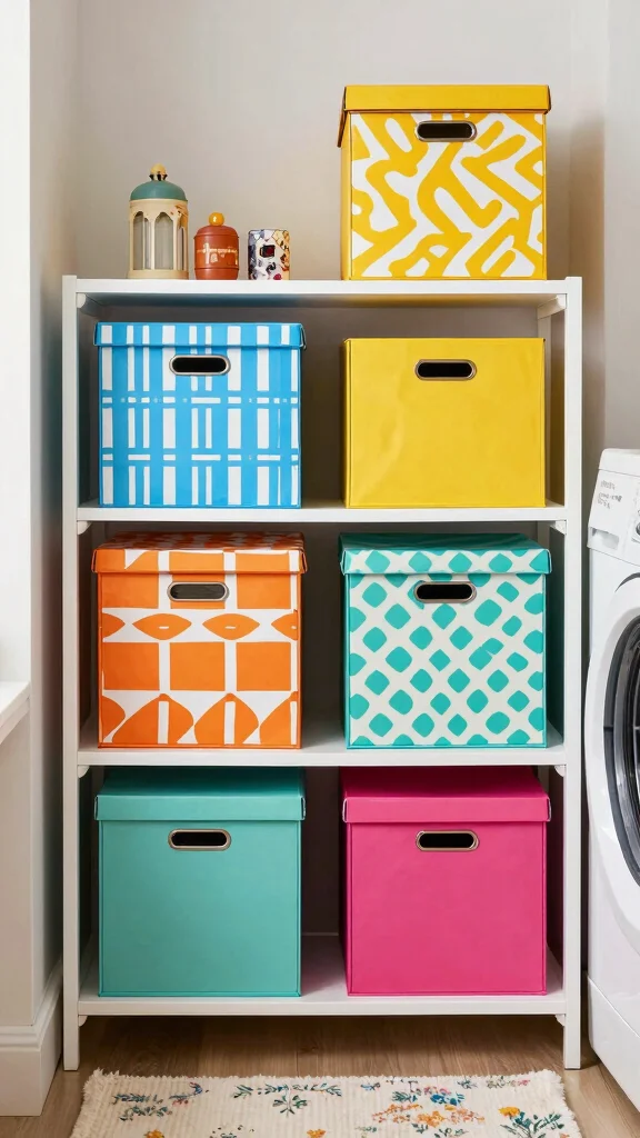 Adding colorful storage boxes to your laundry room can brighten the space while keeping it organized. These boxes can hold everything from laundry detergents to miscellaneous tools, serving as both functional storage and decorative accents. Opt for vibrant colors or fun patterns that align with your laundry room’s theme.