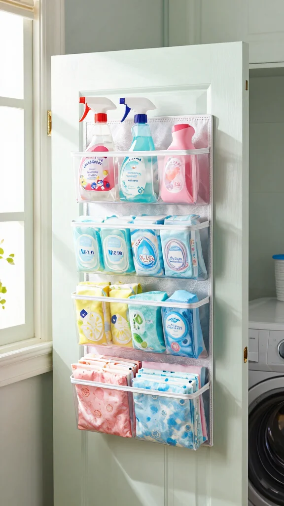 Maximize your laundry door space with over-the-door organizers that keep cleaning supplies neatly stored and accessible. Perfect for smaller items like fabric softener sheets and dryer balls, these organizers require no installation and can be easily repositioned as needed. This flexibility allows you to refresh your laundry area whenever you feel like a change.