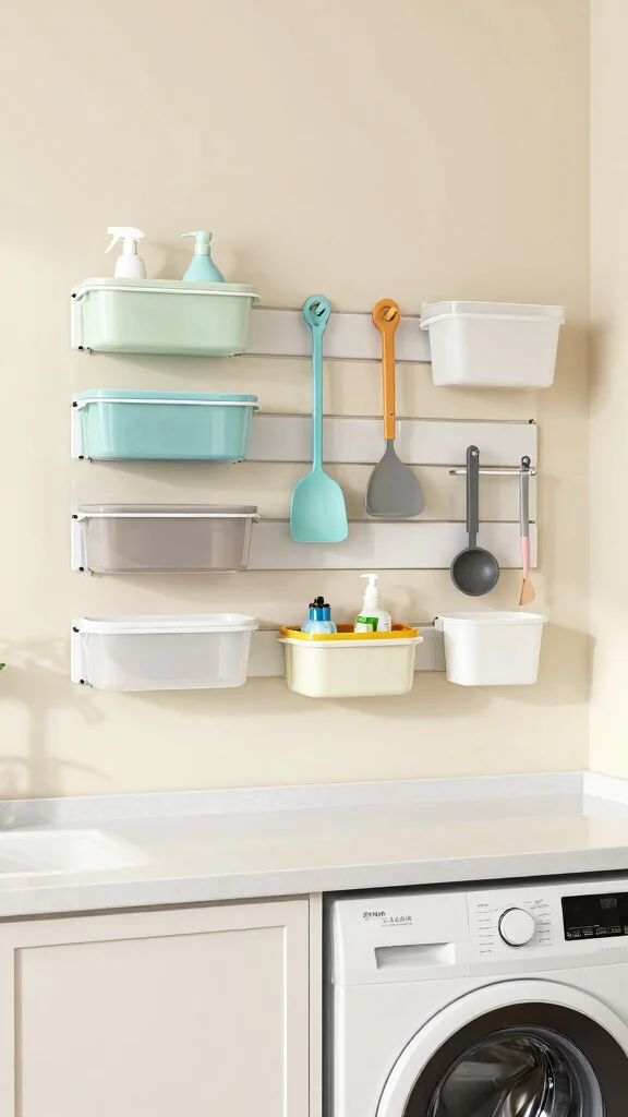 Here are practical laundry room storage ideas that work in tight spaces: maximize vertical space with tall cabinets or ceiling-height shelves, and use matching baskets for a cohesive look. Add a slim rolling cart that fits beside the machines for detergents and brushes. Install an over-the-door organizer for detergents and fabric softeners. Mount a wall pegboard or rails to hang lint brushes, scissors, and small tools. If your layout allows, stack the washer and dryer or use a slim pedestal with built-in storage. Use clear, labeled bins so you can see contents at a glance, and keep a fold-down counter for folding. Finish with a calm color palette and space-saving ideas that feel like storage solutions rather than clutter.