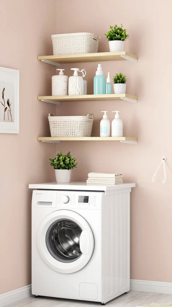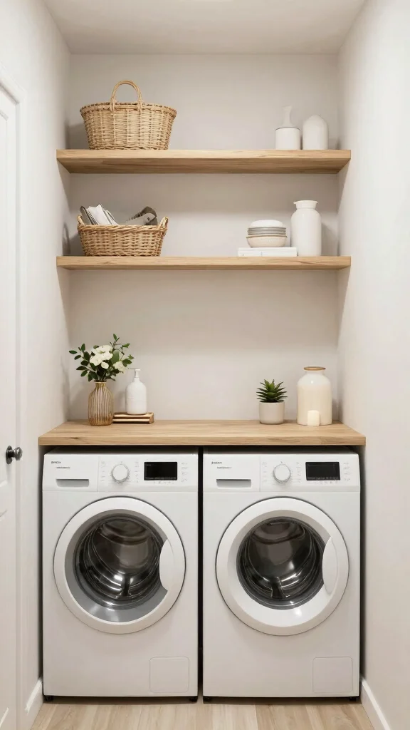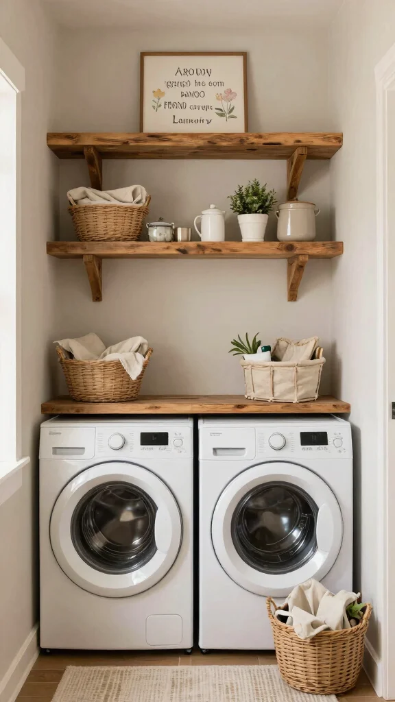 To make the most of this idea, think about open shelving that keeps everything visible yet organized. Use pretty baskets to store smaller items, labeling them for quick retrieval. You can even incorporate art or photos above the shelves, giving your laundry space a personal touch that brightens your day.