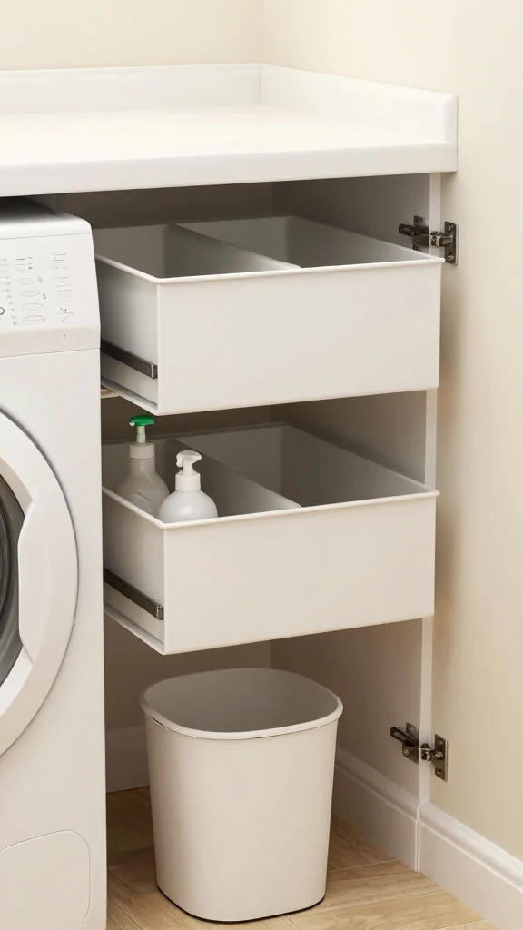 This clever use of hidden storage not only enhances your space but also maintains a stylish atmosphere in your laundry room.